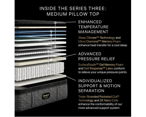Discover where luxury meets innovation with Beautyrest Black®. Designed with Triple-Stranded Pocketed Coil® Technology, this mattress offers increased, individualized support and motion separation with a 2K Nano Coil upgrade. Sleep Climate™ Technology works with a Micro Diamond™ Memory Foam upgrade to enhance heat transfer from the mattress, while SurfaceTouch™ Gel Memory Foam and Self-Response™ Latex upgrades conform to the body for responsive pressure relief. Experience our most advanced sleep system with Beautyrest Black®, so you can rest luxuriously.