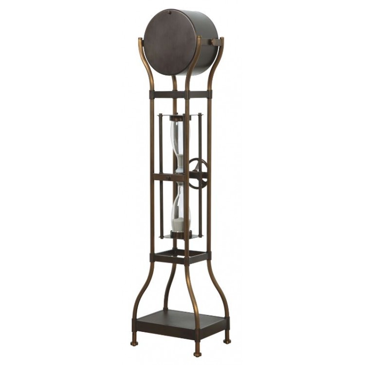 The metal grandfather clock is finished in aged bronze with dark aged bronze accents and features an hourglass which is turned by hand with a handwheel and a metal shelf in the base for displaying items.
