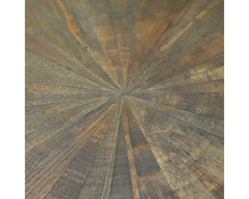 Big enough to host your friends, and with enough style to carry the room, this handsome table features a sunburst reclaimed pine top with a warm burnished brown finish. A collar of champagne metal enhances the simple geometry of the top, which rests upon a truncated cone of black finished resin.