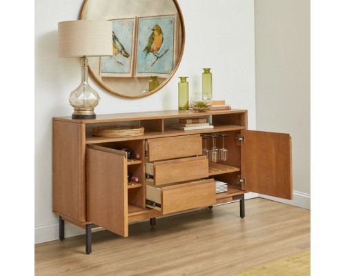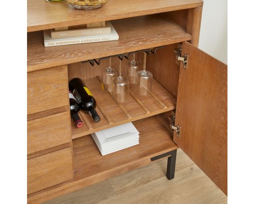 The perfect blend of modern sophistication and rustic charm, Millwork has it all. This piece brings the best of the classic and modern together for a truly unique character. Finished in a warm, umber wood tone that brings a glow, this buffet is sure to be the standout of your bedroom. Two side cabinets, an adjustable shelf, three gliding soft-close drawers, and wine rack provide ample space. Framed in a stylish and durable steel base detailing, this piece is the pinnacle of style and functionality.
