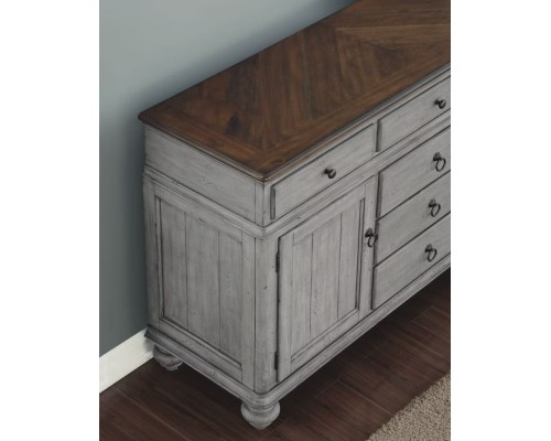 Entertain in relaxed cottage style with everything you need to host dinner guests with this Plymouth buffet. A weathered graywash finish is accented by a medium brown top and gunmetal pulls, while paneled details and turned bun feet add to the cozy vintage character. This buffet features two cabinet spaces with adjustable shelves and a removable wine rack that can store up to 16 bottles. Pair that with six spacious drawers-complete with felt-lined top drawers and a removable silverware tray-and you have ample storage for serving pieces and other dining essentials. Each drawer features ball-bearing glides for smooth access and support for heavy dining ware.